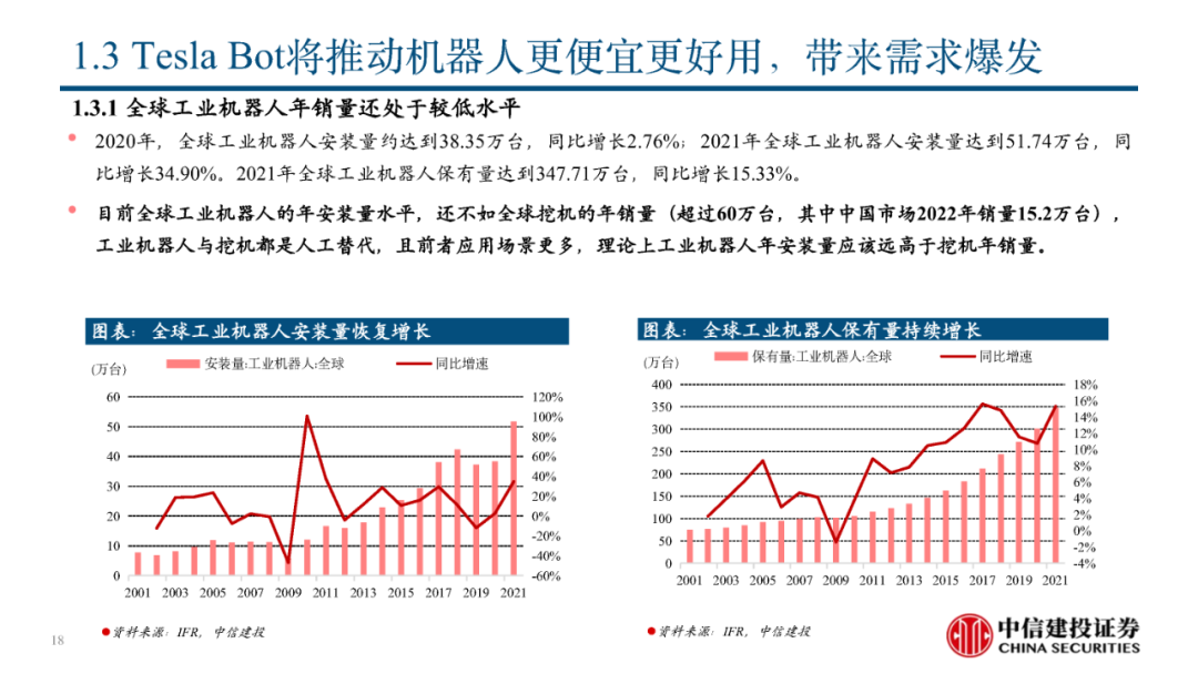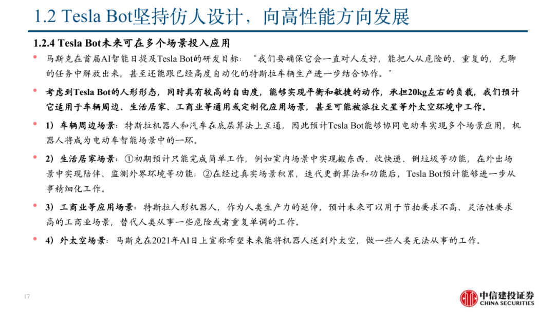 预计人形机器人将会成为数万亿大赛道。人形机器人是AI最有前景的落地方向之一,未来不仅能将人类从低级和高危行业中解放出来,提升人类生产力水平和工作效率,还可以在工业、商业、家庭、外太空探索等领域具有广阔应用场景。根据马斯克公开发言对量价的指引、麦肯锡相关咨询报告以及我们自己的判断,预计当人形机器人产业迭代成熟之后,所对应的年度市场规模会有数万亿元。