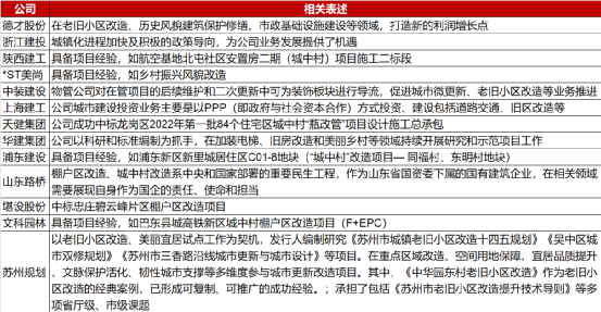 6、土建与装修:城中村改造直接催生工程建设需求,相关土建、装饰类标的或将受益,包括央企、地方建工/路桥国企、以及天健集团/金螳螂/亚厦股份等民营企业。