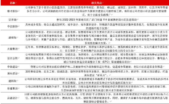 4、建筑设计:城中村改造,不论是拆除重建还是翻新改造,均需要根据当代居民需求提出新的设计方案,带动设计行业迎来新的增长点。我们认为建筑设计类标的均可关注,包括:华阳国际、华设集团、甘咨询、中设股份、建研院、设计总院、建科院、华建集团、启迪设计等。