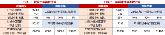 但考虑到部分城市的市区偏激失真(例如重庆,市区面积43264平方公里,远大于广州的7434,但建成区只有1645平方公里略大于广州的1350),因此按照城中村面积与建成区面积的比例,测算城中村总面积。广州城中村面积为743平方公里,建成区面积为1350平方公里,比值约为55%,那么按照40%、50%、60%作为比例,测算城中村的面积,对应22城市分别为7600、9500、11400平方公里,中值为9500平方公里。