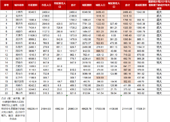 表:22特大、超大城市的城市人口、面积,以及建成区人口
