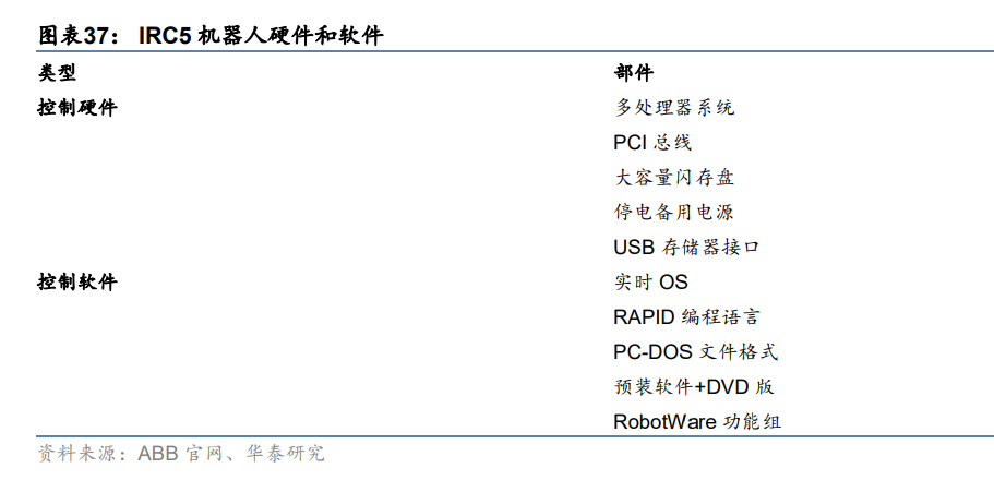 ABB 的 IRC5 是机器人控制器技术的行业标杆。ABB IRC5 控制器包含单柜型、双柜型和 紧凑型,其中单柜型 IRC5 由控制器和 FlexPendant 示教器两个硬件部分组成。使用者可以 在 FlexPendant 示教器或 FlexPendant 示教器上的 RobotStudio 上对机器人进行编程。此 外,IRC5 采取灵活的模块化分布设计。模块化分布设计较集中式控制器更为灵活,IRC5 由控制模块和驱动模块组成,可选增过程模块,使得 IRC5 可以灵活控制一台六轴机器人和 伺服驱动工件定位器。其中,控制模块自带主计算机,能够执行高级控制算法,为多达 36 个伺服轴进行复合路径计算,并可指挥四个驱动模块。此外,IRC5 还提供灵活性、安全性、 模块化、应用程序接口、多机器人控制和 PC 工具支持。