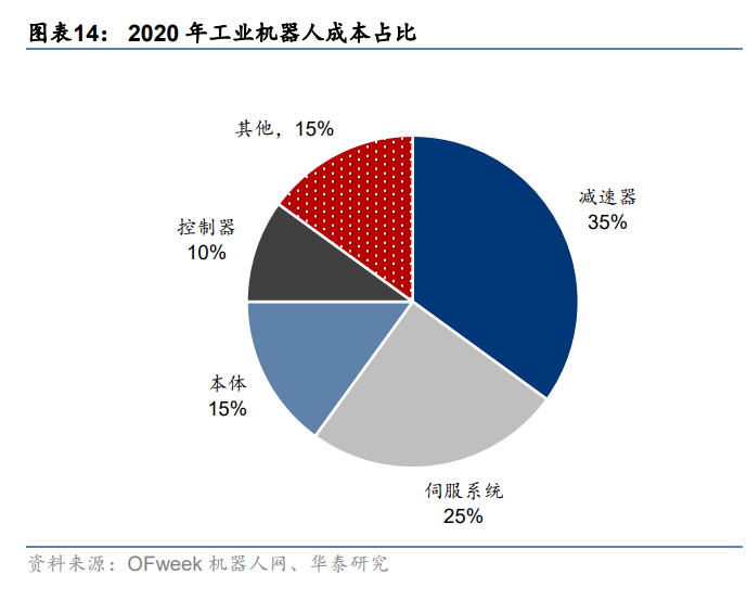 上游核心零部件为工业机器人主要成本来源,盈利能力强劲。从成本来看,2020 年工业机 器人 60%的成本由上游核心零部件构成,其中减速器、伺服系统、控制器分别占比 35%、 25%、10%,机器人本体仅占比 15%。从毛利率来看,盈利能力较强的环节主要集中在上 游核心零部件,2020 年减速器、伺服系统、控制器的毛利率分别约为 40%、35%和 25%, 中游本体制造毛利率较低仅 15%,下游系统集成毛利率较高为 35%。