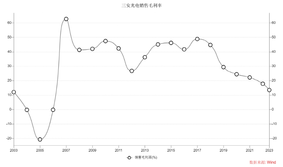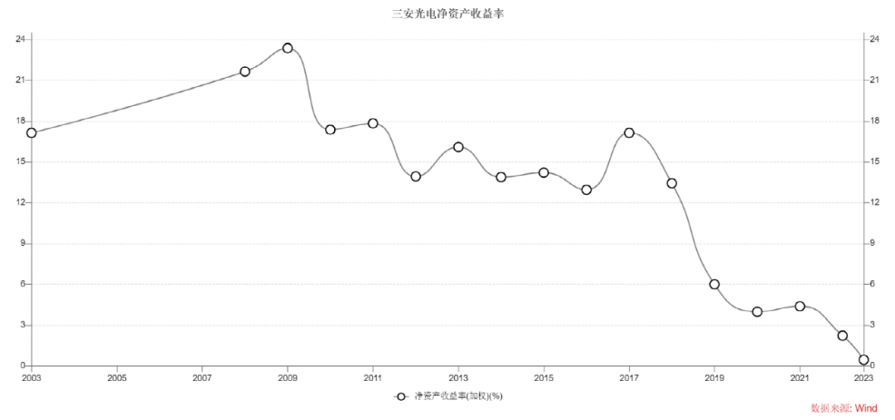 从净资产收益率和销售毛利率来看,2023年上半年末,三安光电也处于公司2008年借壳上市以来的最差水平。