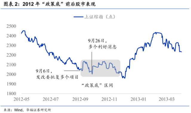 第二,“政策底”出现后,行情也不是马上V型启动,一般会有一个底部反复的过程。2008年9月三大利好出来后行情快起快落,11月即使是四万亿政策出台后,行情脉冲上行又有调整回落,到年底时依然在1800点左右。2012年、2018年的情况也一样,在明确的利好政策出现后,行情短期脉冲后也出现了底部反复震荡。但无论如何,“政策底”区间确认后,短期即使有波动,但我们看到这个区间不会被实质性跌破。而且从过去这三次经验看,底部徘徊时间不久后行情便转而向上。
