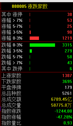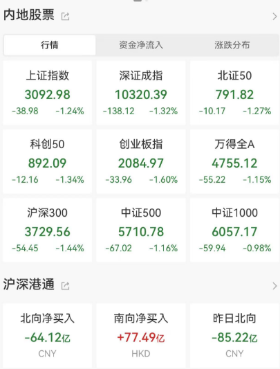 共1387只个股上涨,3695只个股下跌。北向资金净卖出64亿元。