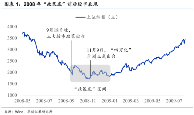第一,很难说单个事件或政策就是“政策底”,“政策底”往往是一连串政策的结果。比如2008年到底以9月的三大利好政策还是以11月的四万亿计划作为“政策底”,肯定有分歧。但如果作为一个整体看,那么就可以比较共识地认为2008年四季度是一个“政策底”。所以“政策底”最好以一个时间区间而非一个时间点去判断。