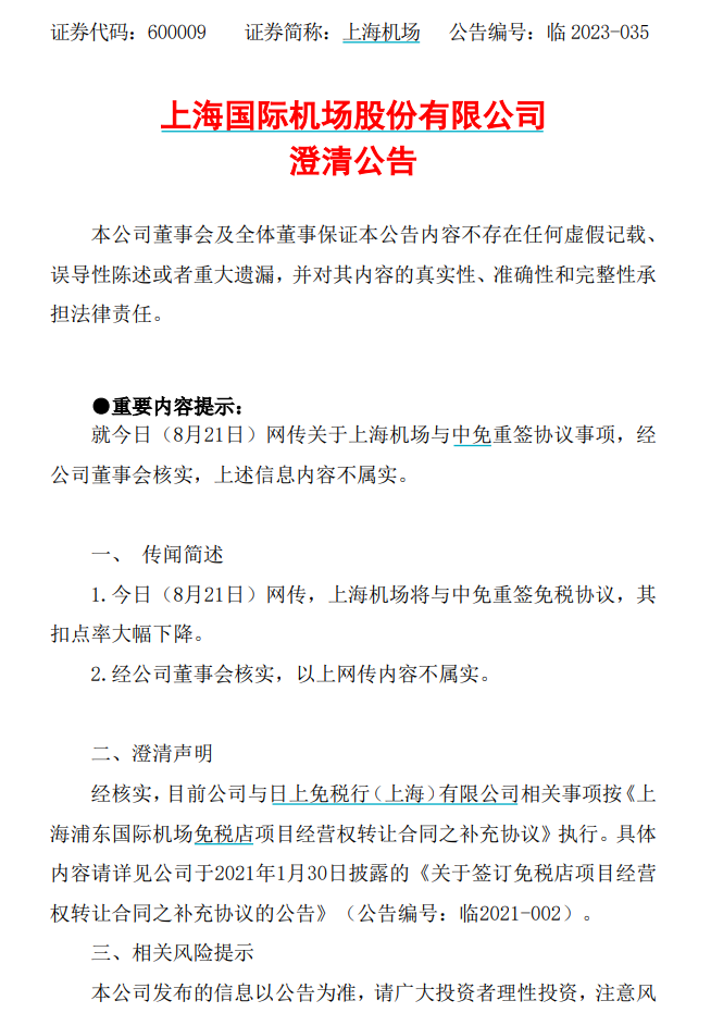 午间,白云机场和上海机场均公告对市场传言进行否认。白云机场表示,与中免没有探讨过扣点调整的问题,目前公司不存在应披露而未披露的重大信息。上海机场则公告,经公司董事会核实,关于上海机场将与中免重签免税协议,扣点率大幅下降的内容并不属实。