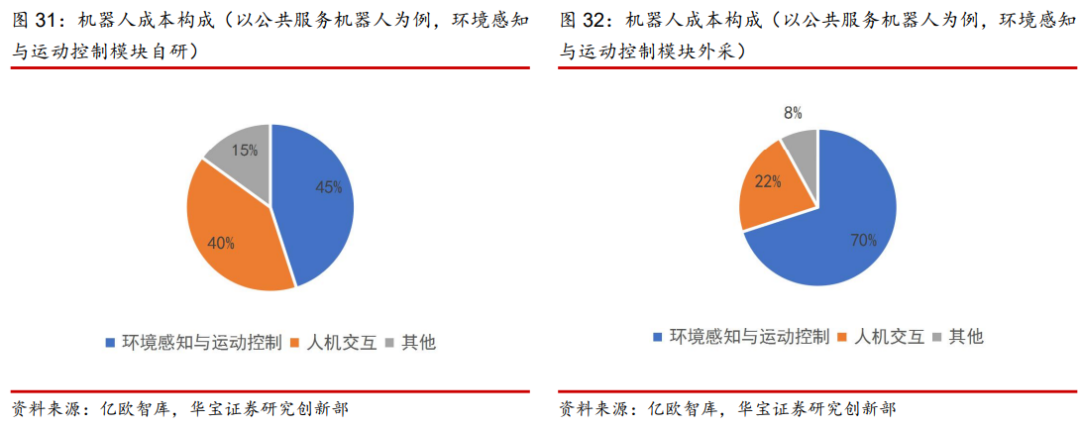 从服务机器人成本构成来看,三大核心模块环境感知、运动控制和人机交互成本占比至少可达 85%。以公共(商用)服务机器人为例,包含三大核心技术模块:环境感知、运动控制和人机交互。环境感知模块即感知系统,运动控制模块主要指控制系统、驱动系统、机械结构系统,人机交互模块主要指交互系统。其中对于本体厂商,人机交互和其他基础软硬件基本实现自研,环境感知和运动控制模块会有企业选择外采,但随着技术的进步以及成本考虑,现在多数机器人企业也实现了环境感知和运动控制模块的自研。环境感知与运动控制模块自研的情况下,三大核心模块的成本占比为 85%,非自研情况下,环境感知与运动控制模块成本占比高达70%,三大核心模块成本占比约 92%。