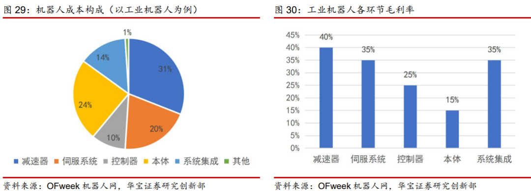 从工业机器人成本构成来看,上游的三大零部件是产业链中技术壁垒高、成本占比较大的环节。上游三大零部件控制器、伺服系统和减速器,成本占比分别为12%、22%、32%,合计成本占比为 66%。从盈利水平看,上游零部件的毛利率相对较高,其中减速器毛利率为40%,伺服系统为 35%,控制器为 25%;中游机器人本体毛利率最低、为15%;下游系统集成毛利率为 35%。