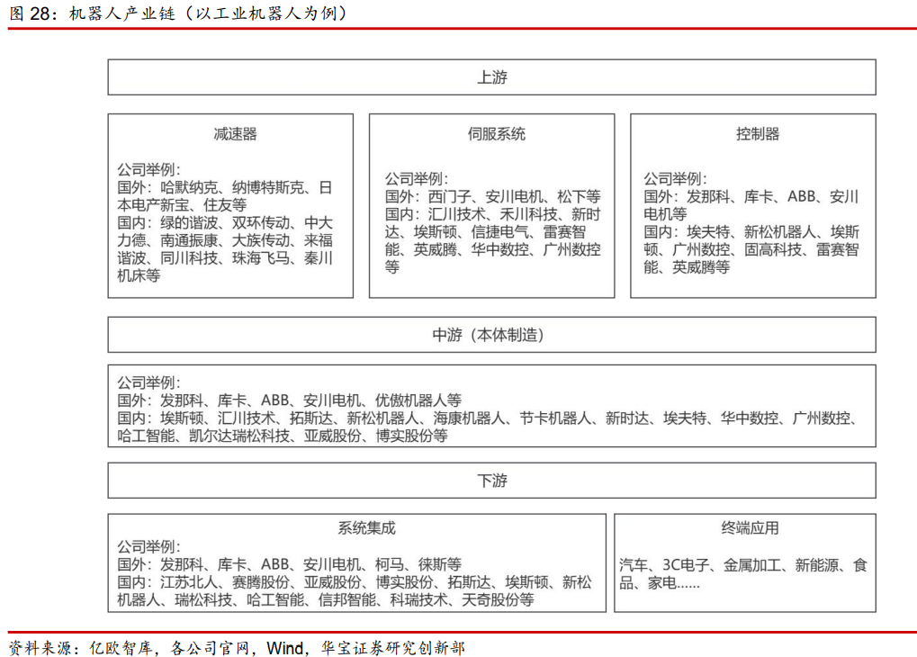 华宝证券指出,我国机器人行业在经历数十年发展后形成完整的行业产业链,工业机器人行业按产业链分为上游、中游、下游和终端应用。上游为控制器、伺服电机、减速器、智能芯片、传感器等核心零部件生产;中游为工业机器人本体生产;下游是基于终端行业特定需求的机器人系统集成商,主要用于实现焊接、装配、检测、搬运、喷涂等工艺或功能。终端应用主要由不同领域的企业客户和个人消费者组成,形成巨大的机器人应用市场。