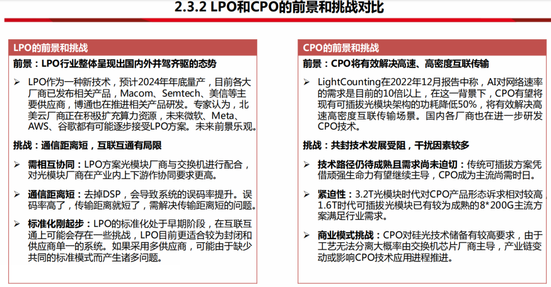中国光模块厂商的国际竞争力大大提高,光模块行业呈现强者愈强的局面 , 行业集中度和规模竞争力优势不断提升。硅光、CPO、 LPO 等前沿技术有望成为未来竞争着力点,二线厂商有望在新技术领域实现赶超。