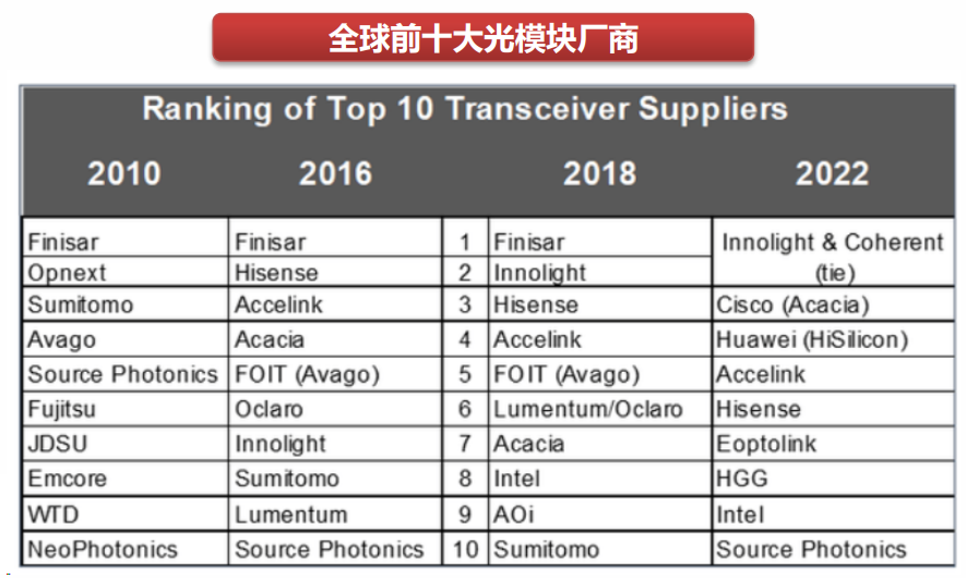 光通信行业知名市场机构 LightCounting 公布了最新版 2022 年全球光模块TOP10榜单。榜单显示,中国光模块厂商强者愈强,一共 7 家入围,海外仅剩 3 家在榜单上。2022 年,旭创科技(排名并列第 1)、华为(排名第 4)、光迅科技(排名第 5)、海信宽带(排 名第 6)、新易盛(排名第 7)、华工正源(排名第 8)、索尔思光电(排名第 10)入围。值得一提的是,索尔思光电被中国公司收购 ,故本期已是中国光模块厂商。