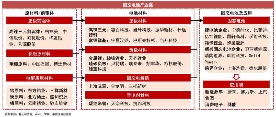 固态电池电解质体系变化显著,并能够带动高能量密度材料应用。材料领域,固态电池电解质将使用氧化物、硫化物、聚合物等体系,实现对传统电解液的替代;正极将搭载超高镍三元或富锂锰基等高能量密度材料,负极也将采用硅材料或锂金属负极,同时高导电性的碳纳米管用量也有望增加。企业布局来看电解质领域涌现出天目先导、清陶能源、赣锋锂业、贝特瑞等一批领先企业;正负极传统龙头容百科技、当升科技、璞泰来、贝特瑞等也在加速延伸布局。在电池领域,传统优势锂电池企业宁德时代、亿纬锂能、中创新航等积极参与,同时卫蓝新能源、清陶能源、辉能科技等新兴企业亦长期深耕固态电池、并积极推动产品量产。