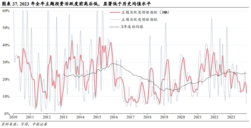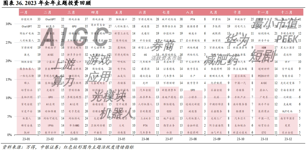 以全部829个万得概念主题指数月相对全A超额涨跌幅超4%的主题数量占比(3MA平滑后)构建主题活跃度情绪指标,2023年主题活跃度整体不高,从该指标年内走势来看,全年主题活跃度高峰期集中在1-5月、11月,其余时间主题行情偏弱。全年主题除AIGC相关领域外,9、10月份的减肥药和华为汽车成为为数不多的主题亮点。