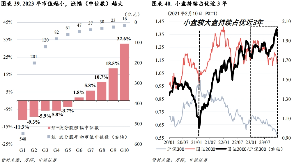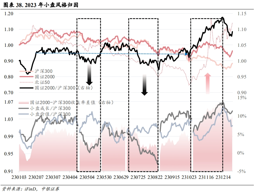 整体而言,全年小盘风格占优的超额收益其实仅是由(2月上中旬、10月下旬开启的)两波区间上涨所贡献,以国证2000/沪深300走势来看,在2月中旬至10月中旬这整整八个月中,国证2000相对沪深300的超额收益并不明显,更多处于窄幅震荡之中。2023年真正的小盘强势表现其实只发生在年初和年末两个“窗口”内。