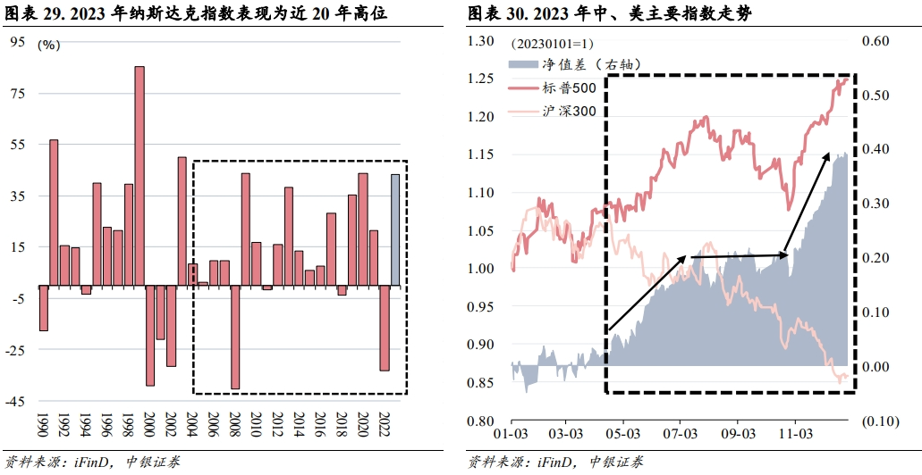 2023年中国经济周期和A股权益市场,在经历过一季度的良好开局后便逐渐承压,而对于海外主要经济体,特别是美国权益市场,2023年的关键词却是“西降推迟”,在全年消费和投资端持续超预期的情况下,年初市场预期的美国经济衰退不断被证伪,不仅如此,在AI赛道加持下,美股纳斯达克指数走出了2020年中国创业板的赛道行情,创下了近20年较佳的年度表现。