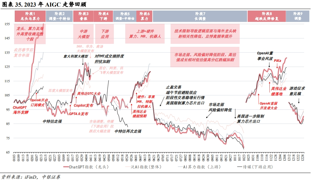 AIGC是2023年全年的结构性主线。在AIGC行情演绎的初期,针对行业与配置的错位,我们针对性的提出了“先验”和“后验”逻辑,“产业趋势”投资和“主题投资”之间的区别,以及海外映射的系统性投资方法。回顾今年AI行情走势可见,在阶段2、阶段5都发生过明显的调整,这种调整的触发因素包括1)成交阶段性过热、止盈;2)盈利真空期担忧;3)海外映射减弱、国内AI催化减弱;4)经济预期下行市场整体RISKOFF带来的防御性板块阶段性相对收益跑赢等原因。但2023年AIGC行情的高波动特征,特别是海外映射的两次断点,才是最值得回顾的方面。