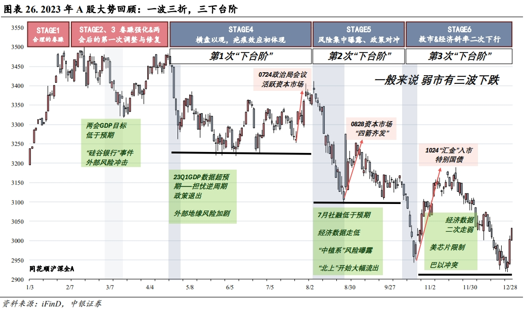 第三次下台阶。国庆长假后,全A进入年内“第三次下台阶”阶段。由于美国进一步限制先进算力芯片出口,叠加巴以冲突升级以及国内9月CPI、PPI低于预期,北上资金延续流出态势,冲击了市场情绪,市场加速回调并跌破3000点。尽管10月底,以汇金为代表的“平准”类型资金开始“真金白银”买入以及特别国债发行等,实质性地提振了市场情绪。但10月和11月的PMI数据和CPI数据均低于预期,进一步证明了本轮经济回升的斜率有所放缓,市场再次震荡探底破位,并持续至年终。