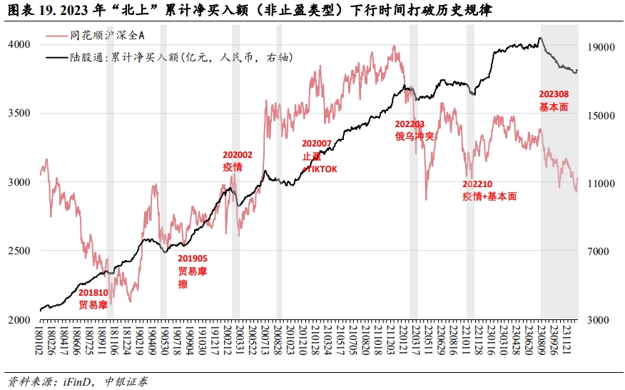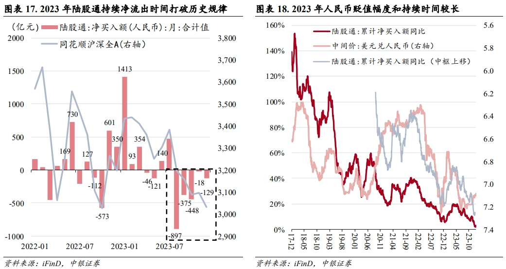 我们在《行业配置月报23年10月北上行为三段式》中,基于过去北上资金大幅流出阶段的规律进行了资金特征层面的规律统计,并总结了“三段式”的资金行为特征。但事后来看,2023年8月开始的北上资金历史第七次大幅流出,明显打破了前六次流出时的行为规律,主要体现在第一阶段净流出持续时间长,第二阶段磨底持续时间长,且截至2023年底,北上资金尚未进入到第三阶段。总体而言,2023年北上资金流出金额创下了历史极值,但更意外的是,连续五个月(8-12月)的净流出持续时间也是从未出现过的。