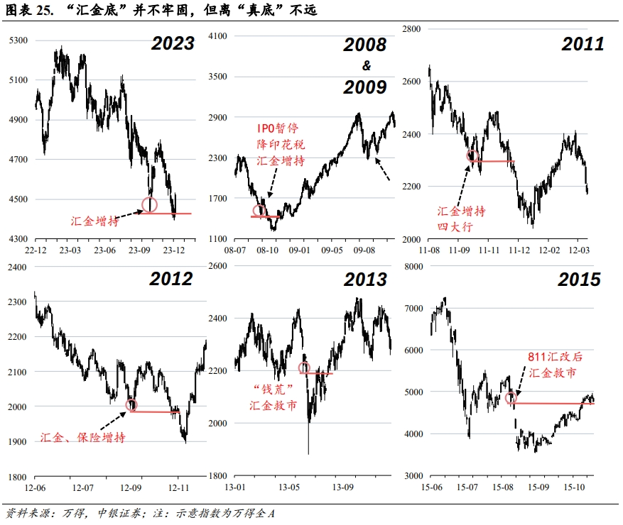 回头看,8月28日资本市场“四箭齐发”当日,A股高开低走,市场将关注重点转向量化机构,随即对量化的部分限制措施出台,而之后沪深300指数在12月5号,跌破前底(汇金买入底)破位。当我们回顾历轮救市的过程可见,单纯的救市举措较难改变指数原有的上行下行趋势,短暂利好带来的反弹,终究或要还回去。我们回顾历史上“汇金”有参与记录的典型六轮救市举措如2008/2009/2011/2012/2013/2015年,从结果来看,救市后都出现过继续下行的情况,但另一个角度来看,距离趋势性反转也较为接近。