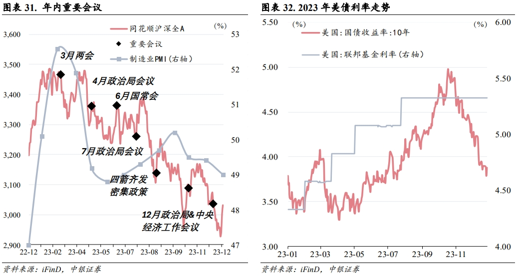 外因方面,对海外经济数据与美联储紧缩节奏把握欠缺。一是23年初美国经济数据不及预期,通胀降温叠加部分官员释放鸽派信号,市场即预期美联储加息周期在23 年内或有放缓。特别是3月硅谷银行危机使市场避险情绪升温,联储阶段性“扩表”, 避险交易推动 10 年期美债收益率大幅下行至 3.30%,加剧了市场对于加息节奏放缓的乐观情绪。但随着中小银行危机缓解叠加美国经济数据持续超预期,自3月议息会议至 7 月议息会议,美联储分别于3月23日、5月4日和7月27日加息25BP,美债收益率加速上行至 4.34%。二是自7 月议息会议至 11 月议息会议,受美国经济韧性和美债供需失衡持续扰动,加之巴以冲突不断升级,尽管美国核心通胀持续下行,美联储暂停加息,但鲍威尔释放“higher for longer”信号,市场对加息周期持续“更久”的预期升温,美债收益率快速上行至 4.98%的年内高点。三是10月下旬后,本轮加息周期对美国经济的负反馈逐步兑现,美国经济数据先后验证经济放缓的趋势。11月FOMC会议后,市场对加息周期触顶形成共识,美债收益率高位回落,截至 12 月 29 日,10 年期美债收益率收于 3.88%。