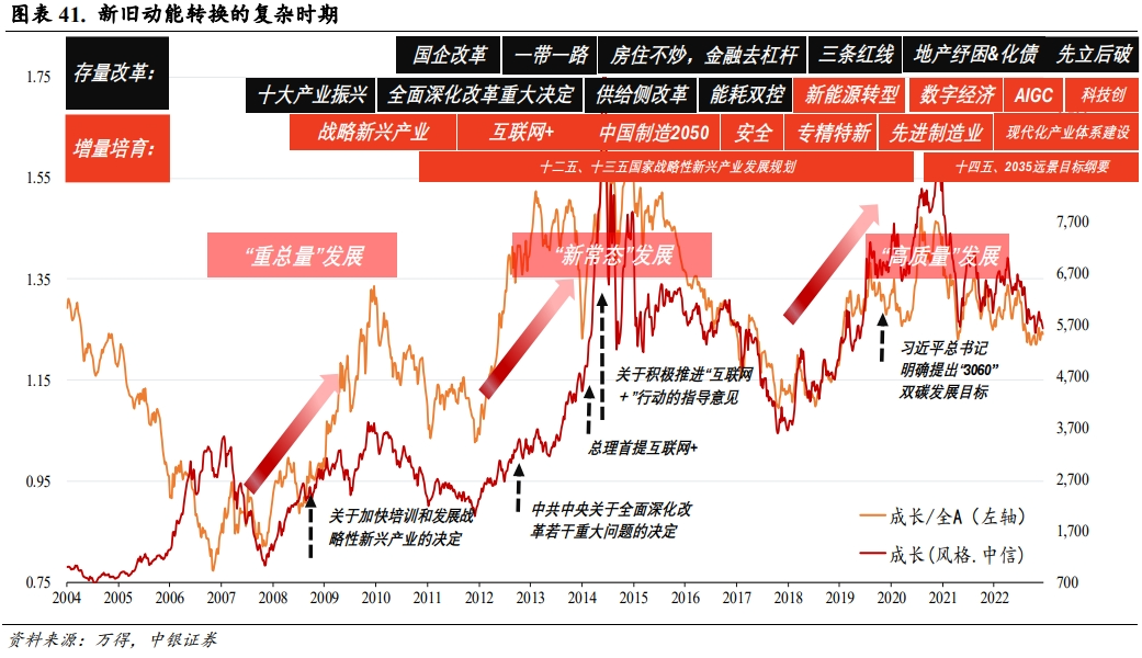 2023年内外环境的复杂性以及废旧立新的波动进程或使得市场预期仍会出现阶段性反复,站在当下,政策逆周期防风险,总量波动性降低,高质量发展诉求下,绝对增速不再是唯一衡量指标。传统产业逐步退场,新兴产业初见端倪。结合国内及海外先发国家历史经验,主导产业转换的过程中,不可避免地会面临经济增速的波动以及市场预期的反复筑底,而转型阵痛期结束后,市场将会走出新主导产业引领下的结构牛。