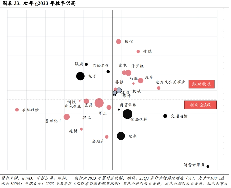 景气投资2023年胜率较高。一级行业2023年相对全A涨跌幅与其2023年三季报累计盈利同比增速对比来看,在所有28个一级行业中,处于有效区间的行业个数为20个,胜率为71.4%,在所有107个二级行业中,处于有效区间的行业个数为60个,胜率为56.1%。综合来看,一级、二级大部分行业年内表现仍与当年业绩(次年g)相关性较好,从胜率角度来看并不差。