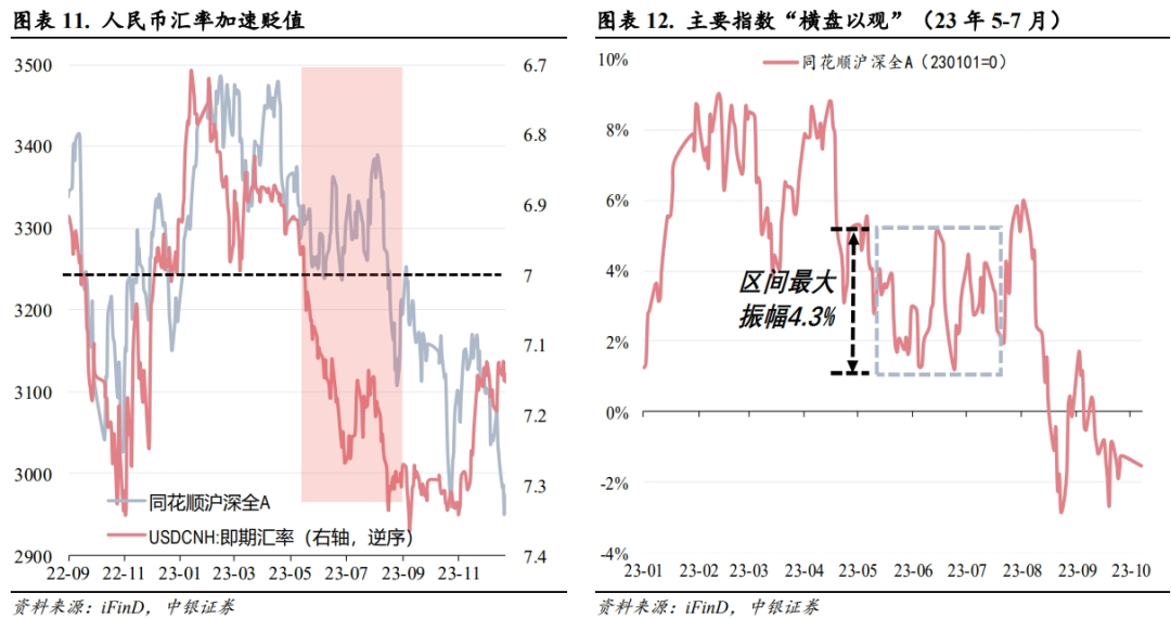 这一阶段,尽管指数低波动,但离岸人民币汇率发生了较为剧烈的波动,5月初以后汇率开始快速贬值,并在5月17日跌破7.0后继续下行,与股市的“横盘已观”形成了明显悖离。
