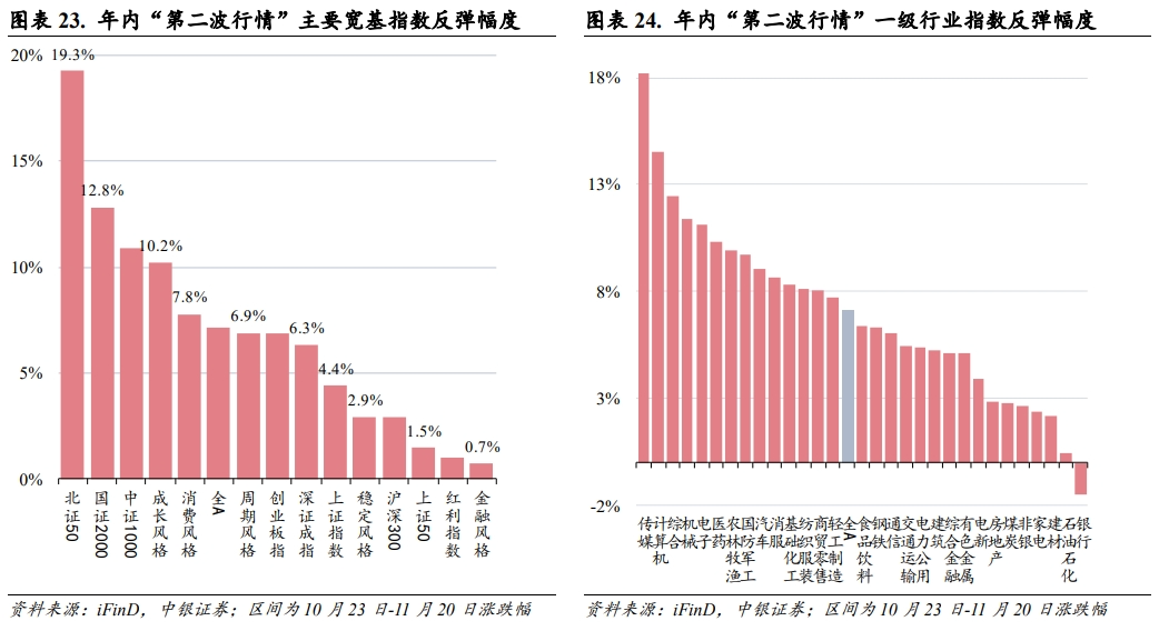 在10月23日到11月20日这一区间内,尽管全A涨幅仅有7.1%,上证指数涨幅仅为4.4%,(略低于我们在《困难年份也有两波行情》基于历史数据测算的第二波全A上涨幅度平均值9.0%),但结构性行情的涨幅却非常突出,贡献了年内第二次重要的“赚钱效应窗口”,这其中小市值风格的中证1000、国证2000指数涨幅为10.9%、12.8%,风格指数中成长和消费风格录得10.2%、7.8%涨幅,一级行业中传媒(18.2%)、计算机(14.5%)、机械(11.4%)、电子(11.2%)等行业赚钱效应居前。