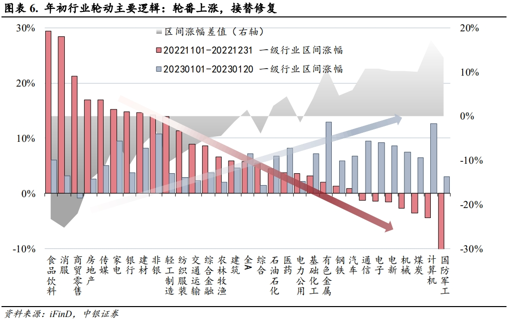 历史上的春季躁动的经验来看,一般是延续上一年的行情思路,在2022年10月底,疫情防控措施调整后,市场普遍预期我们将赢回失去的三年,疫后的报复性消费以及制造业的加速赶工是投资者最期待的景象,因此2023年年初的“春躁”行情在思路和逻辑上仍然延续的是2022年10月触底反弹修复的思路,鉴于2022年10月前指数及行业的系统性估值压缩,2022年10月后,各行业的递次修复成为这一轮春躁的主线,2022年年末的行业修复以疫情期间压制幅度最大的消费类行业领衔,进入2023年后,此前修复力度较弱的行业,开启了明显的补涨和接替修复现象。