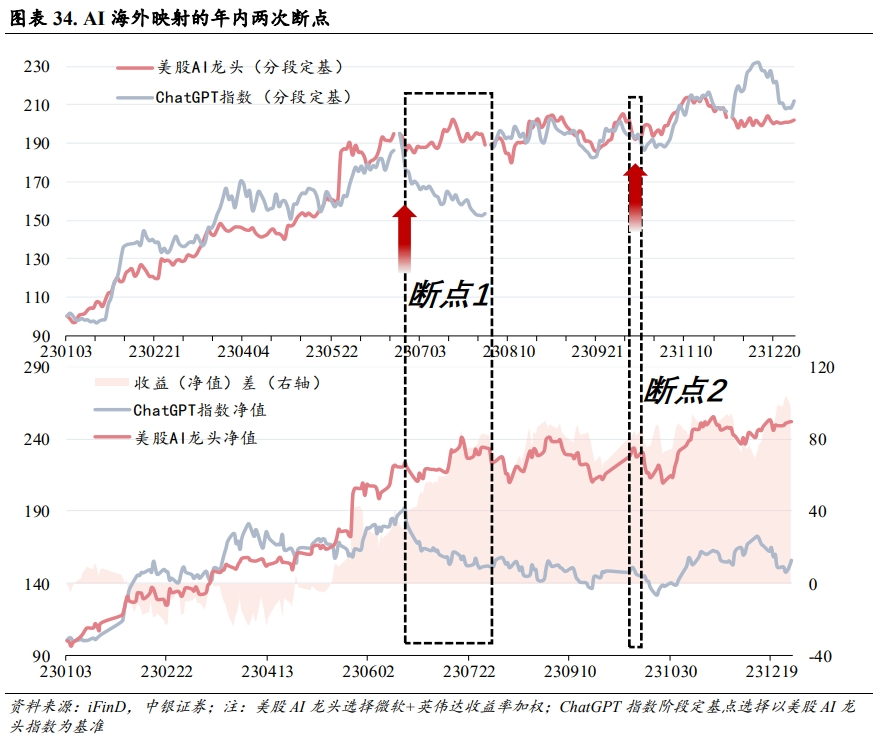 第二次断点。10月17日,美国商务部工业和安全局(BIS)发布了针对芯片的出口禁令新规,进一步升级对于中国半导体的制裁,新规将在30天后的11月16日生效。10月18日,英伟达发布公告对于与其相关的限制政策及影响进行了说明。美国政府的新规修订了ECCN3A090和4A090,并对向中国以及其他D1、D4、D5类国家和地区出口规定了额外的许可证要求。公司受限产品包括但不限于:A100、A800、H100、H800、L40、L40S及RTX4090。此举引发了市场担忧,人工智能主题概念出现一定退潮。但根据科大讯飞2023年10月19日的投资者关系活动记录表,当前华为昇腾910B能力已经基本做到可对标英伟达A100。10月24日,华为与科大讯飞合作发布基于昇腾生态的“飞星一号”大模型算力平台,在此基础上,讯飞星火大模型将开启对标GPT-4的更大规模训练。10月25日,国家数据局正式揭牌。随着人工智能加速落地,硬件板块三季报业绩兑现程度高,AI算力迎来加速国产化时代,再次对AI赛道起到了积极催化作用。由于此前回撤幅度较大,且市场对限制预期的逐步计价,这一轮的断点在美股AI龙头公司同步回撤下,虽然仍对A股AIGC行情产生冲击,但海外映射层面未形成悖离。
