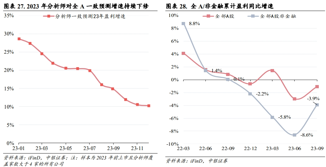 这里最明显的证据是整体分析师的盈利预测年初值普遍较高,然而实际全A非金融盈利同比增速在中报下滑到-8.6%,虽然在三季报修复至-3.9%,但仍处于收缩区间,分析师盈利预测值也在年中呈现出了非常明显的不断下修。