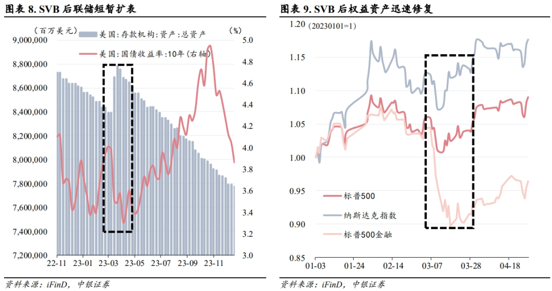 在恐慌情绪蔓延的几天内,部分担忧情绪更是将本轮银行危机对标2008年的雷曼破产事件,全球金融市场在硅谷银行危机发酵之时,直至瑞信银行危机处理落地的这10天内仍受到了显著冲击,但危机本质是部分银行在进行旗下资产管理时未有效对冲美债收益率波动的风险,且本次银行业危机发酵之初,美国及瑞士监管机构的应对速度更快,应对措施更加合理,及时阻断了风险扩散及恐慌蔓延,站在事后来看,3月中旬的海外银行风险冲击事件在及时处置之后成为了较典型的点状冲击,而非系统性影响,针对此事件冲击而产生的跌幅都被迅速修复,并未形成明显次生影响。