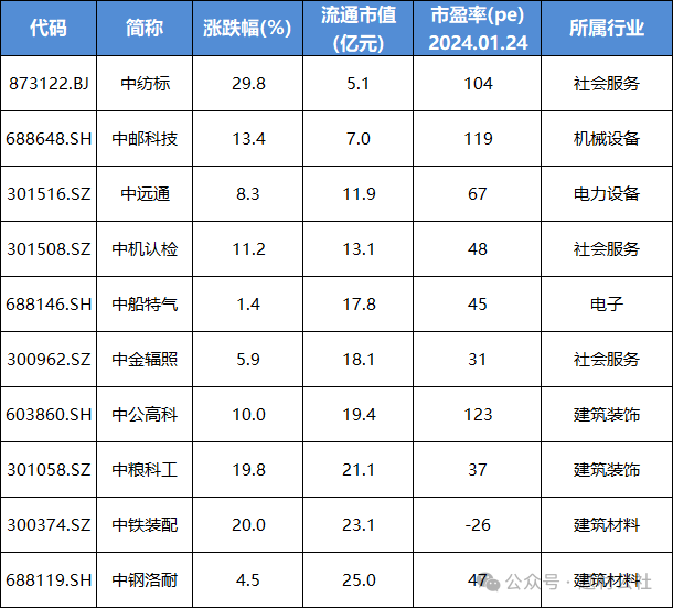 10cm首板:中铝国际、中交地产、中国联通、中国医药、中青旅、中国动力、中国科传、中国出版、中钢国际、中公国际、中远海科、中煤能源、中国石油、中信金属、