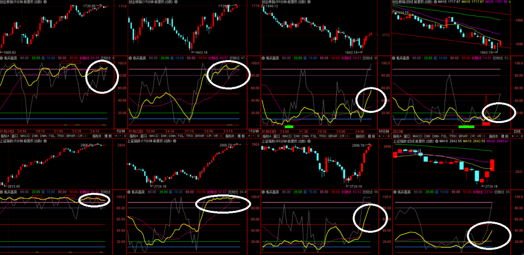 下图上排依次是创业板指的5分钟图、15分钟图、60分钟图、日线图。
