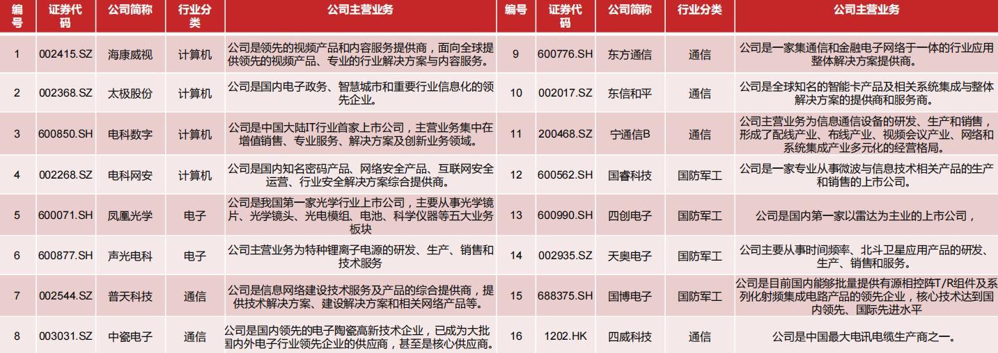 2)中国电科:中央直接管理的国有重要骨干企业,是我国军工电子主力军、网信事业国家队、国家战略科技力量。