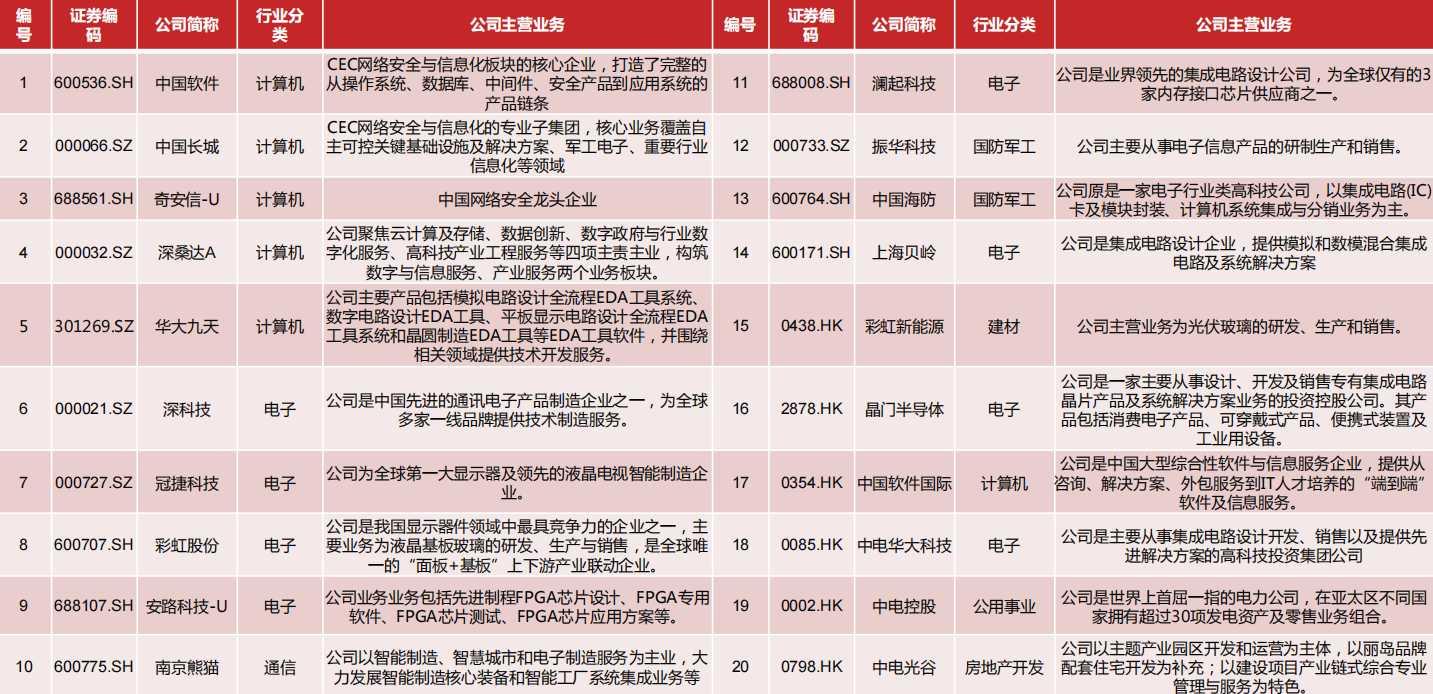 1)中国电子:成立于1989年5月,是我国民族电子工业的摇篮,是中央直接管理的以网信事业为核心主业的中央企业。