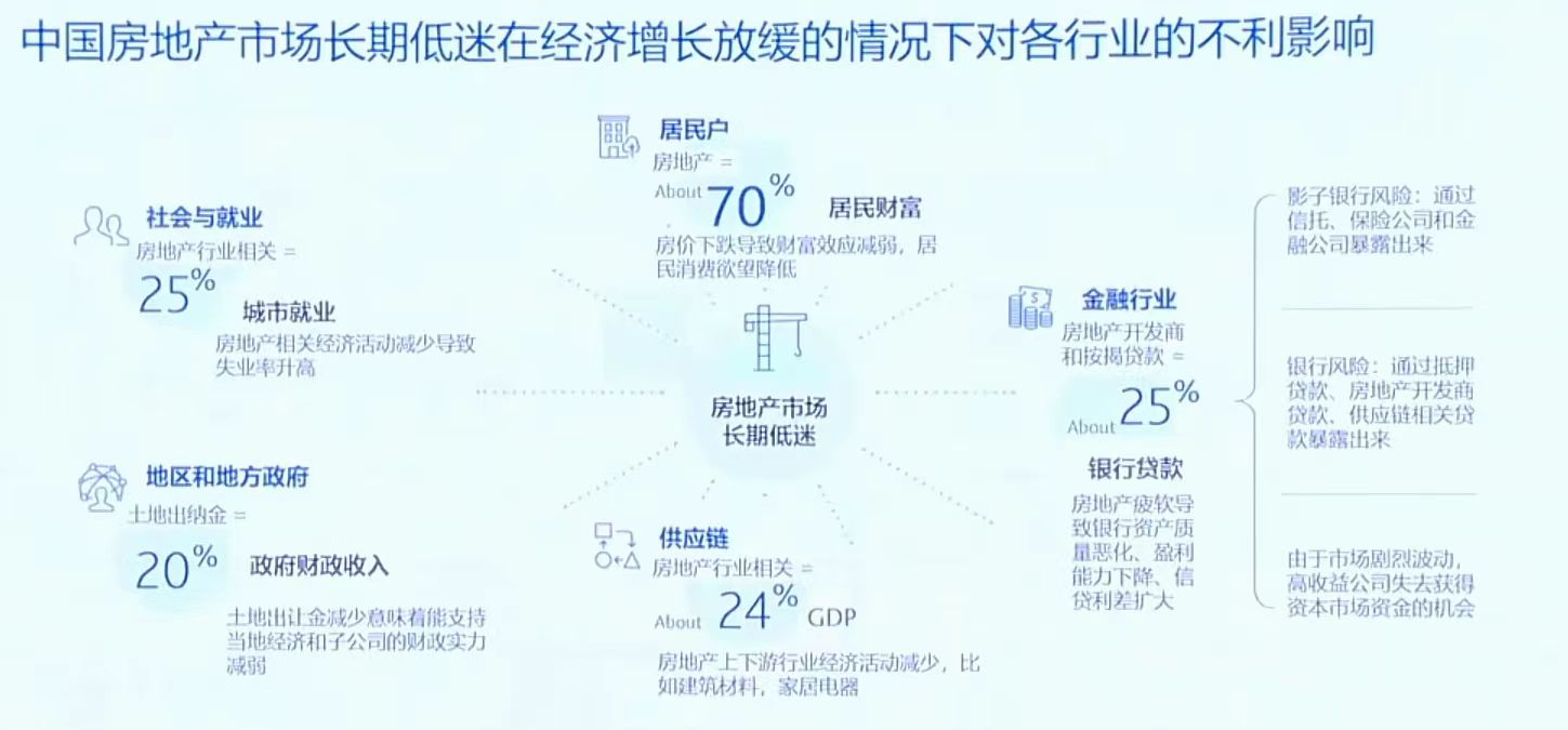 地产行业关系着地方政府20%的财政收入、24%的GDP、25%的社会就业、25%的银行贷款、70%的居民财富,牵一发而动全身。地产稳了,经济就稳了,金融系统风险就消除了,市场信心就回归了,股市也会好起来。股市好了,居民消费信心也就好了,买房欲望也就增强了,有利于楼市稳定与复苏。