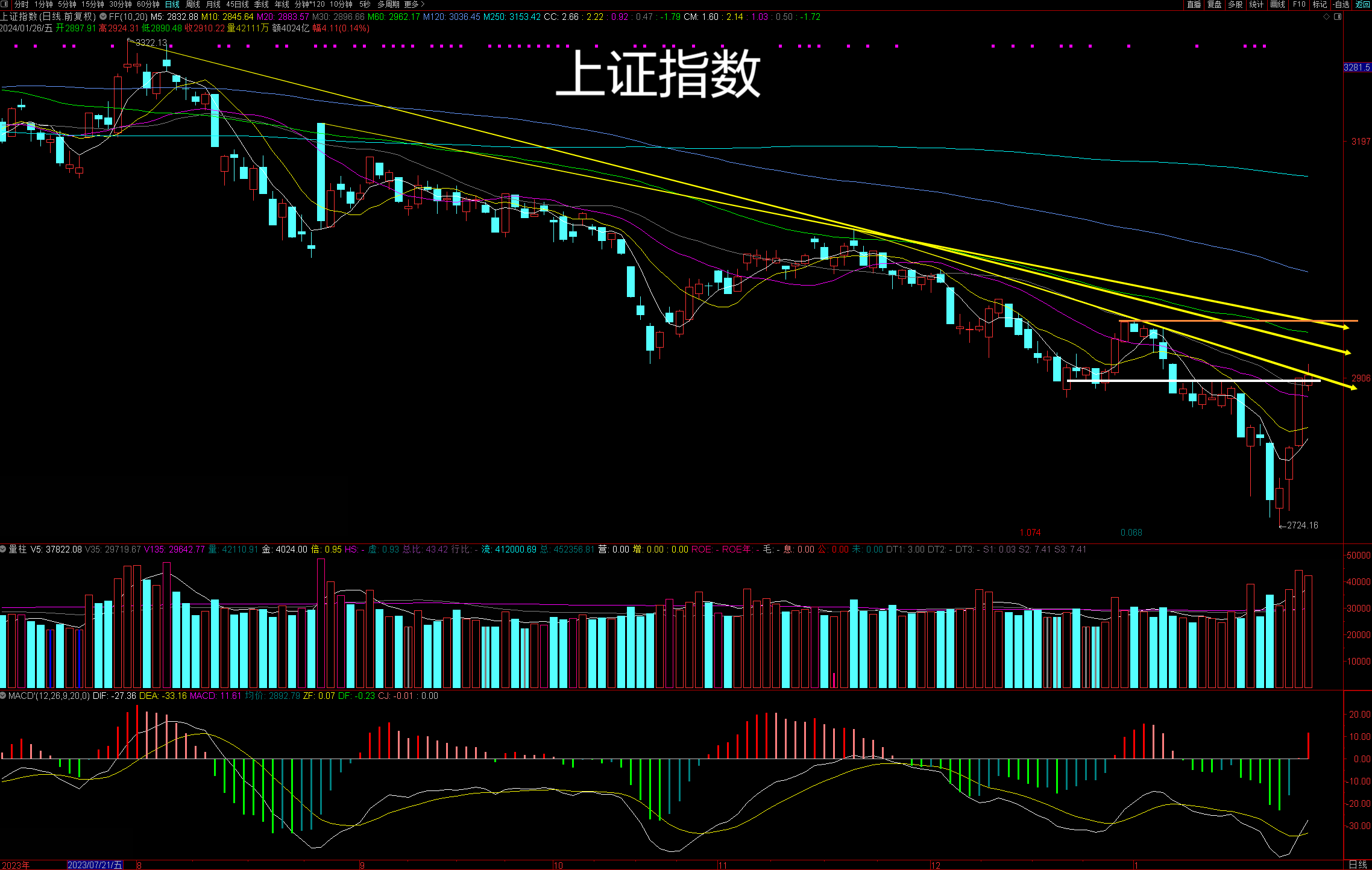 本周的大涨有政策面的配合,有资金面的投入,是多方协力共同救市的结果。主力已经接连出手,冲锋的号角已经吹响,救市的成果不会轻易再让空头吞并。我认为,2724点成为阶段性底部或重大底部的可能性非常大,不论是短线还是中线,市场向好的一面运行的概率比较高。会不会就此走出牛市,这个结论我现在还下不了,还需要进一步观察。