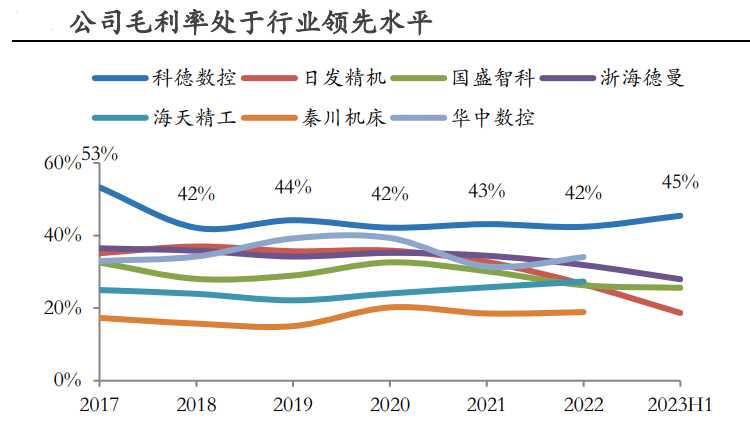 并且公司毛利率也是超强的。2023年上半年毛利率达到了45%,在制造业中是很罕见的,并且远远领先日发精机、海天精工、华中数控等对手。