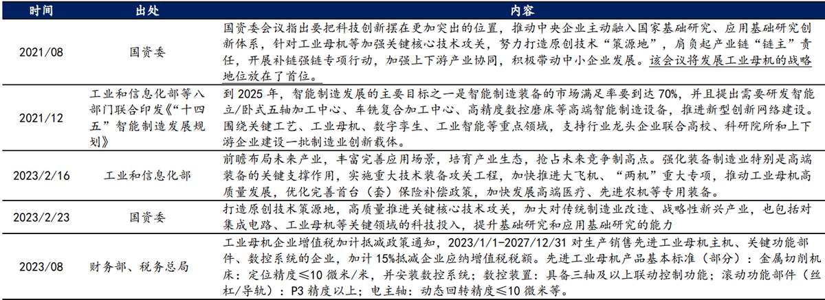 从2021年以来,关于工业母机的促进措施就接连不断,这一方面得益于航空、汽车等新方向的需求;另一方面也是解决卡脖子。