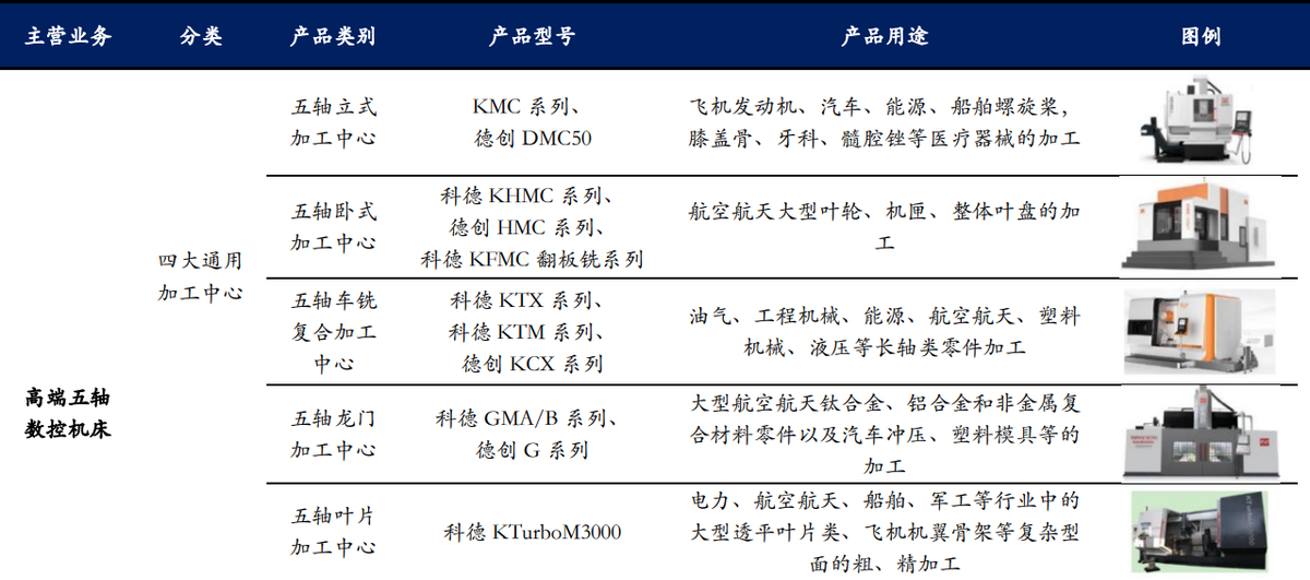 公司数控机床的核心产品是高档五轴联动数控机床,包括五轴立式(含车铣)、五轴卧式(含车铣)等,产品线非常丰富。