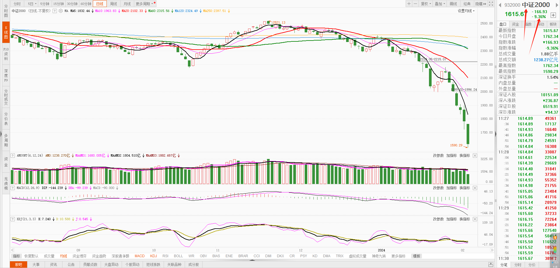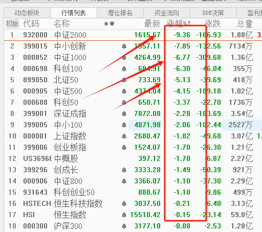 今天看起来虽然市场盘中有所拉升,但是我们要注意到,中小盘已经马上跌停了!中证2000下跌9%点多!