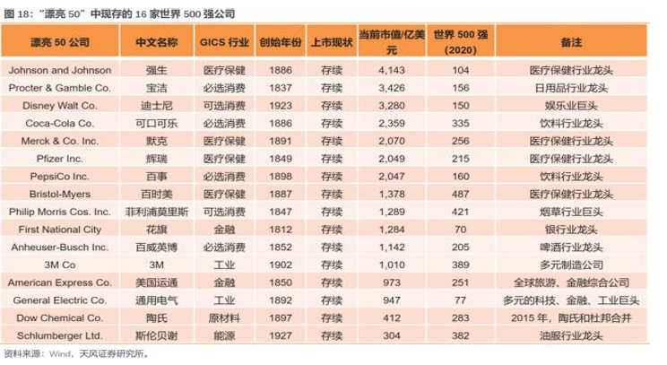 漂亮50有哪些公司呢?我们可以看以下这张表,大家对这些公司耳熟能详,譬如强生、宝洁、迪士尼、可口可乐等等。它们也就是所谓的龙头股,或者是绩优股。