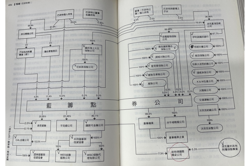据以下这幅图,我们可以看出蓝筹印花当时较复杂的股权结构。1974年初,蓝筹印花又并购了西科金融。这些公司构成了整个伯克希尔·哈撒韦的基石。