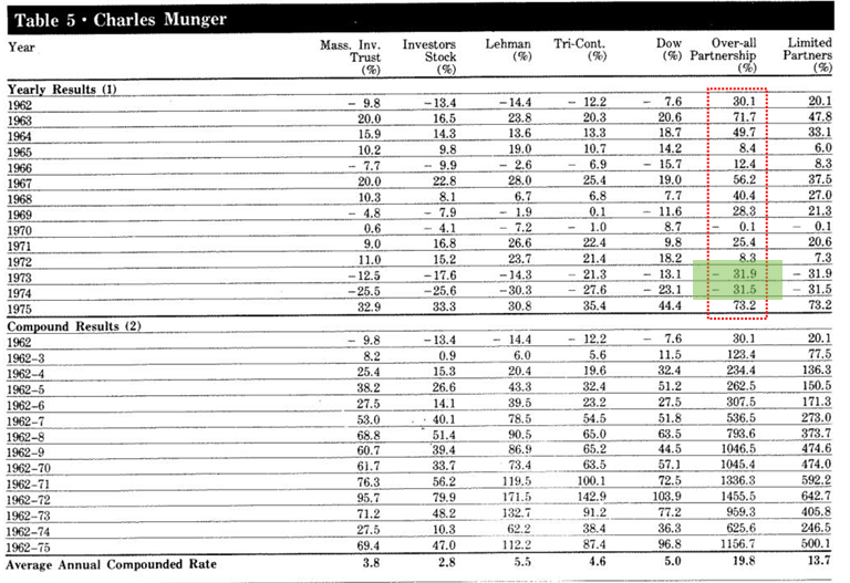 首先,我们先来看一张图表(注:这张表源于巴菲特在哥伦比亚大学纪念格雷厄姆与多德合著的《证券分析》出版50周年的庆祝活动中所发表的演讲),红框里面就是芒格合伙企业的净值图。