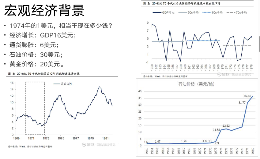 结合当时的宏观经济背景,大概从1973、1974年的时候,美国出现了通胀现象。大家可以从以下这幅图得知当时的石油价格。
