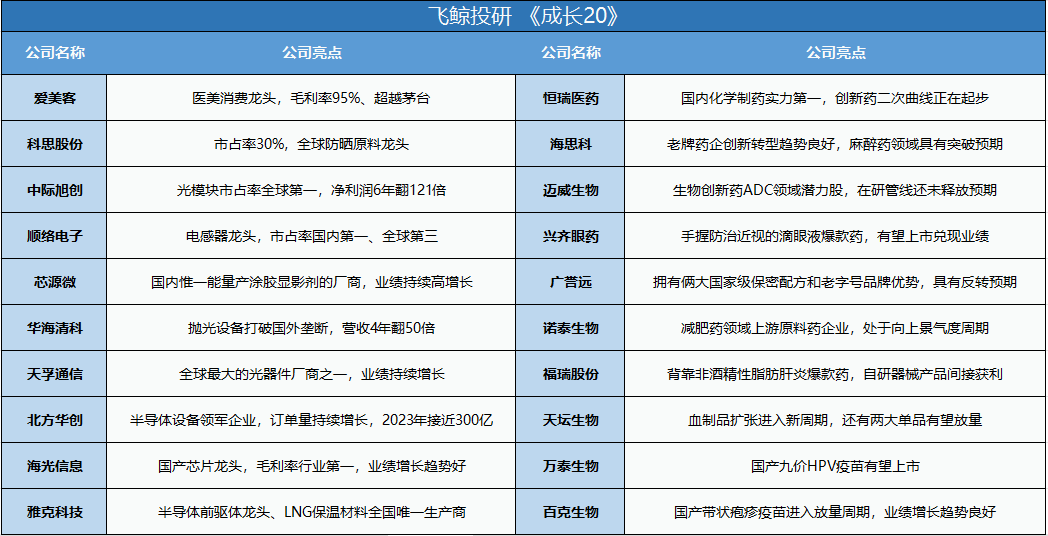 大规模医药公司一直是我们的重点研究对象,所以上图中的企业飞鲸覆盖过不少,其中东阿阿胶和康龙化成还是2023年《成长20》榜单中的企业。