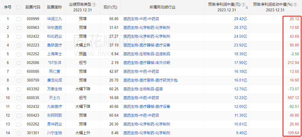 不少医药公司发布了2023年业绩预告,下图是我按净利润规模排名列出来的14家公司,从预告净利润增速来看,大部分企业的业绩都是增长的,只有个别公司因为自身业务问题业绩有所下滑。